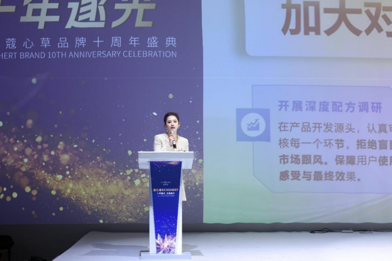 庆典现场,草木心化妆品(深圳)有限责任公司执行蔻心草品牌董事长深情致辞:“这十年是坚守初心的十年,更是与无数用户、伙伴并肩同行的十年。我们始终相信,真正的品牌力量源于对品质的敬畏和对用户的真诚。”